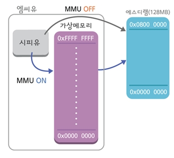 엠엠유 OFF 상태일 때는 시피유가 에스디램 어드레스를 접근을 하지만 엠엠유 ON일 때는 가상주소로 접근을 한답니다. 가상의 주소는 실제로 에스디램처럼 물리적인 메모리가 있는 것이 아니라 단지 어드레스만 제공하고 실제 데이타는 에스디램에 있답니다.