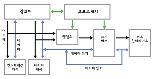 시피유 내에는 암코어, 코프로세서, 엠엠유, 캐시메모리 기타 등등이 있지요. 여기서 코프로세서가 하는 역할은 엠엠유 ON/OFF, 캐시 메모리 ON/OFF등을 한답니다. 코프로세서는 CP15라고 불려지기도 하죠. 그림과 같이 인스트럭션 캐시와 데이터 캐시에 어드레스와 데이터 선이 따로 연결되어 있는 것을 하바드(Harvard) 설계 방식이라고 합니다. 주로 암9 이상부터 많이 사용하는 방식이랍니다. 이렇게 인스트럭션 캐시와 데이터 캐시에 어드레스와 주소가 따로 있다는 것은 인스트럭션 캐시에 명령어를 읽을 때 데이터 캐시에 쓸 수가 있어서 성능이 매우 우수하죠.