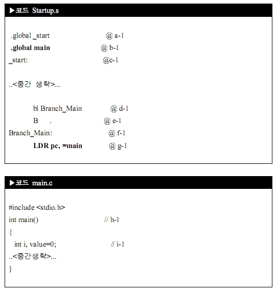 Startup.s 파일에서 .global main(b-1)이라고 선언을 해 주고 main(g-1)으로 call하면 됩니다. 간단하죠. 여기서 주의하셔야 할 내용은 대소문자랍니다. Startup.s 파일의 두 군데(b-1,g-1)에서 대소문자를 썩어서 사용했다면 main.c에서 main함수 이름도 Startup.s 파일에서 지정한 이름과 동일하게 작성을 해야 하죠.