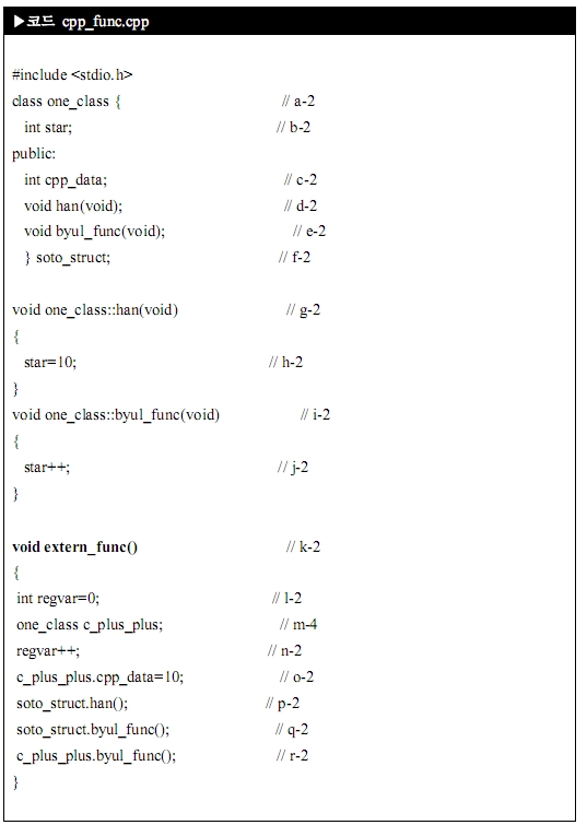 class안의 두 함수 void han(void); (d-2) , void byul_func(void); (e-2)는 프로토타입이라고 해요. 이렇게 선언된 함수 자체를 정의(g-2, i-2)할 수가 있답니다. 여기서 one_class의 멤버 함수임을 나타낼 때 스코프 해상도 연사자(scope resolution operator)인 "::"을 사용한답니다.