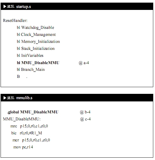 Startup.s 파일에서는 mmulib.s 파일에 있는 레이블 이름만 콜(a-4)하면 되고, mmulib.s 파일에서는 레이블 이름을 선언(b-4)해 주고, 레이블 지정(c-4)한 다음 내용 내용을 작성하면 됩니다.