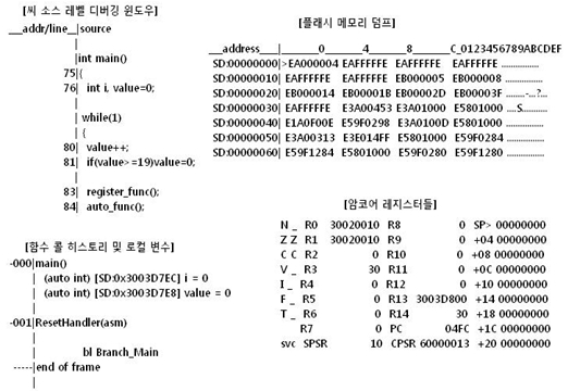 씨 소스 디버깅 윈도우는 개발자가 만든 씨 소스레벨로 한 라인씩 실행을 하면서 프로그램 수행 순서를 모두 추적해 볼 수가 있도록 도와 주죠. 해당 소스라인에 브레이크 포인트를 사용해서 프로그램이 수행하면서 해당 위치에서 멈추게도 할 수가 있죠. 플래시 메모리 덤프는 플래시 메모리에 들어 있는 바이너리를 보거나 패리퍼럴 레지스터 값을 읽어올 수가 있으며 직접 레지스터에다 데이터를 쓸 수도 있답니다. 예를 들어 GPIO 25핀에 RED LED가 있으며, 개발자는 RED LED에 High 신호를 줘서 LED ON하는 프로그램을 만들었는데 LED가 On 안 된다면 무엇일 문제인지 디버깅을 해 봐야 하죠. 이를 경우 PIO25핀에 해당 되는 곳을 덤프하고 그 때의 값이 무엇인지 확인 해 봐야 하죠.
