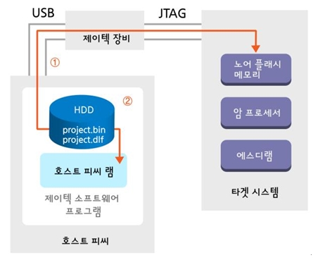 제이텍 소프트웨어 프로그램을 통해서 우선 project.bin를 타겟 노어 플래시 메모리에 Write를 합니다. 그리고 다시 project.elf을 호스트 피씨 램에 다운로드를 하죠. 어떻게 하냐고요?