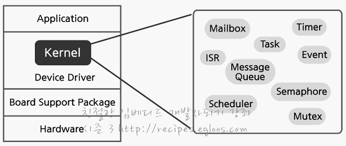 신뢰성이란 오동작시 치명적인 문제를 일으킬 수 있으므로 높은 신뢰성이 요구가 되지요. 확정성은 필요에 따라 기능을 추가, 삭제 할 수 있는 유연함이 요구 된답니다. 예측성은 실시간 요구사항을 만족하기 위해서 일정 수준이상의 동작이 예측 가능해야 한답니다. 간결성은 자원의 한계로 인해 간결하게 설계하는 것이 요구 된답니다. 고성능은 시간 제약을 만족하기 위해서 충분히 고성능이어야 하지요. 이러한 특성을 갖추기 위해서는 알티오에스의 핵심인 커널이 아주 잘 설계가 되어 있어야 해요. 커널을 이루는 구성요소는 메일박스, 타스크, 메시지 큐, 스케쥴러, 세마포어, 타이머, 이벤트, 뮤텍스, 아에스알 등으로 이루어져 있답니다.