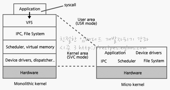 모놀리틱 커널과 하이퍼바이저인 마이크로 커널은 커널 영역Kernel area)과 유저 영역(User area)으로 나누어 져요. 커널 영역은 오에스에 대한 전반적인 실행 코드가 있는 부분이라고 보시면 되고 유저 영역은 어플리케이션이 실행 코드가 있는 영역이랍니다. 암 프로세서로 하나의 임베디드 시스템 개발한다면, 중요하게 살펴 봐야 될 사항이 두 가지가 있는데 바로 시스템 콜과 암 프로세서 모드(ARM Processor mode)랍니다.