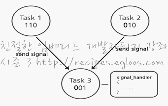 시그널(Signal)은 임의의 태스크에 소프트웨어 인터럽트를 거는 방법으로 태스크간의 수행하는 일들의 순서를 저장하죠. 이벤트 그룹과는 다르게 태스크마다 하나씩 존재하죠. 시그널은 태스크 내에서 인에이블을 해야 하고, 시그널 핸들러를 등록해 줘야 동작한답니다. 시그널은 사용하는 태스크는 32bit 비트의 플래그(flag)를 세트 해서 전달을 하고, 받아들이는 태스크는 시그널과 일치하는 플래그 값이 하나라도 있으면 동작 시키게 한답니다. 아래와 같은 경우라는 Task 2가 동작하게 되죠.