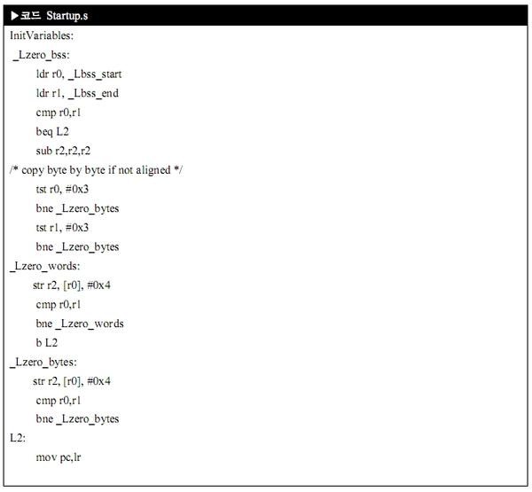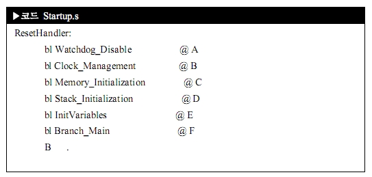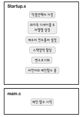 와치독 디세이블(Watchdog disable)을 먼저하고, 인터럽트 디세이블(Interrupt disable)과 시피유 및 주변 장치 클럭 설정을 해 주세요. 그리고 에스디 램이 접근 가능하도록 해야 스택 공간이 확보가 되겠죠. 끝으로 초기화 되지 않는 변수들을 초기화를 해 주고 나면, 씨 언어의 main함수로 진입을 하게 한답니다.
