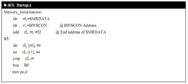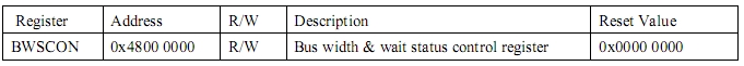 C 단계, 이제 에스디 램을 읽고 쓰기를 할 수 있는 메모리 컨트롤러 설정이랍니다. BWSCON은 0x4800 0000 번지이고 데이타 값을 입력하면 되죠. 데이타 값은 Bus width & wait status 과 같은 값이랍니다. 이처럼 메모리 컨트롤러에 해당 되는 모든 내용을 설정해 주면 되지요.