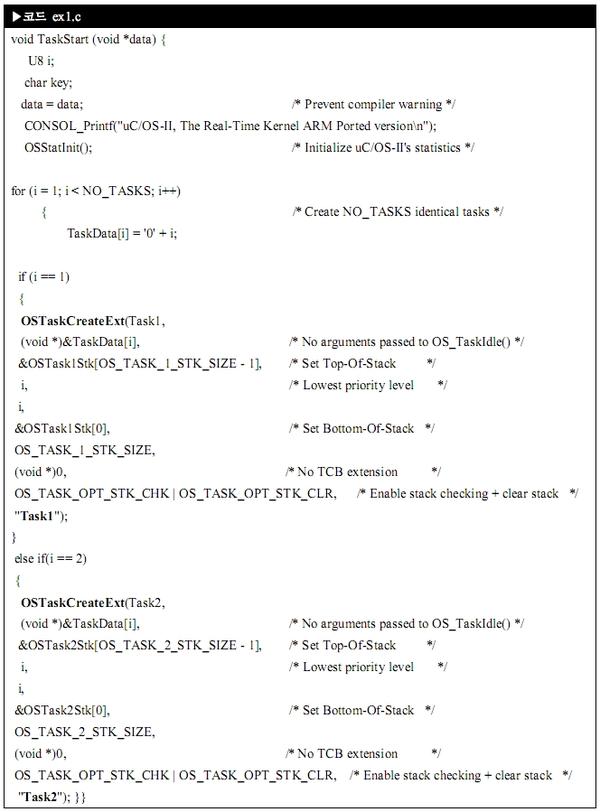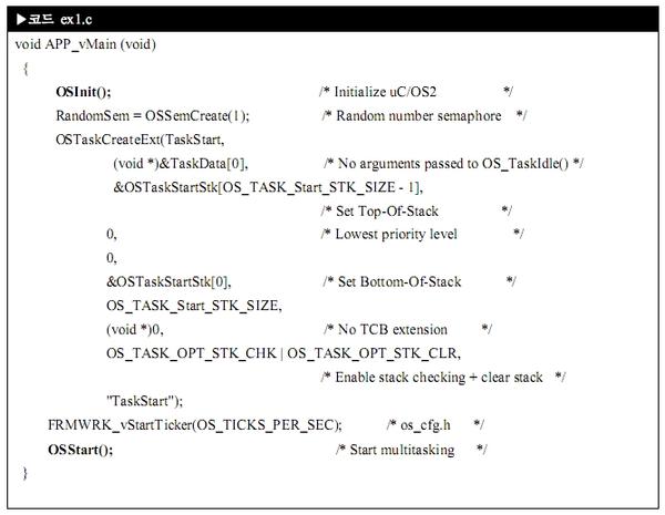 개발자는 여기서부터 어플리케이션을 만들면 된답니다. 어플리케이션 개발의 첫 단계가 uC/OS2 초기화 과정을 거친 후 어플리케이션에 해당하는 태스크를 생성하면 된답니다. OSInit 함수에서 OS_TaskIdle, OS_TaskStat 라는 두 개의 태스크를 만든답니다. 그리고 APP_vMain 함수 마지막에서 "TaskStart"라는 태스크를 만들어요.