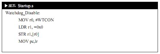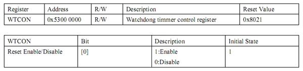 A단계, 와치독 디세이블을 하기 위해서는 와치독 관련 레지스터 주소와 데이타 값을 알아야 하죠. WTCON을 시피유 데이타 시트에서 찾아보니 0x5300 0000 주소이며, 0 bit 값이 '0' 으로 입력이 되면 디세이블이 된다고 나와 있군요.