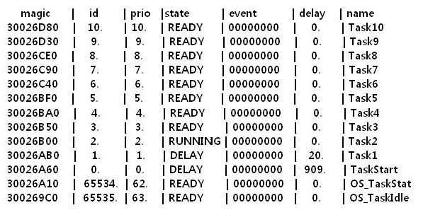 TaskStart 태스크의 TCB를 보도록 하죠. 현재 태스크의 스택 사이즈나 우선 순위 값들을 자세히 볼 수가 있군요.
