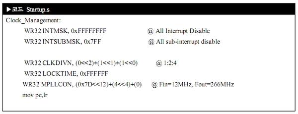 이제 다음으로 클럭 설정이랍니다. 제일 먼저 클럭 분주를 설정해야 하는데 FCLK, HCLK, PCLK 3개로 구성되어 있어요. FCLK는 주로 ARM920T 프로세서에서 사용되고, HCLK는 AHB bus 또는 ARM920T 프로세서, 메모리 컨트롤러, 인터럽트, 엘시디 컨트롤러, DMA와 USB Host에서 사용된답니다. PCLK는 APB 버스에서 사용되는 페리퍼럴쪽인데 WTD, IIS, I2C, PWM timer, MMC interface, ADC, UART, GPIO, RTC 그리고 SPI에서 사용됩니다. 각각 분주는 1:1:1이 기본값이지만 1:2:4를 추천한다고 되어 있어요. 개발자 마음이지만 이왕이면 추천하는 대로 해야 안전하지요. 마지막으로 Input frequency를 설정한답니다. MPLL이라고 하죠.