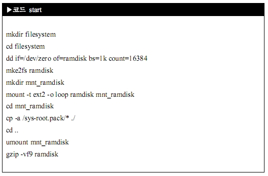 이러한 작업을 반복적으로 해야 하니 쉘 스크립트로 만들고 난 후 실행 권한으로 바꾼답니다. 마지막으로 실행을 해 보면 램디스크 파일 시스템이 만들어 진답니다.