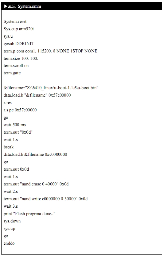 부트로더는 커널(zImage)을 에스디램으로 복사를 하기 위해서 플래시 메모리를 쉽게 접근할 수가 있다고 이야기한 바가 있습니다. 그래서 부트로더는 부트로더(u-boot) 자기 자신과 zImage, ramdisk.gz 파일을 플래시 메모리에 넣을 수가 있으며, 일반적으로 플래시 메모리에 쓰기를 한다고 표현하죠. 하지만 어디까지나 이것은 플래시 메모리에 부트로더가 있다는 가정하에 그렇죠. 만약 플래시 메모리에 부트로더가 없다면 최초에 한 번은 하드웨어 장비인 JTAG으로 부트로더를 플래시 메모리에 쓰기를 해야 하죠.