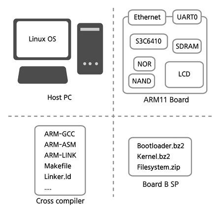 호스트 피시에 Linux 설치 - 크로스 컴파일 설치 및 환경 설정 - 부트로더 빌드 - 커널 빌드 - 파일 시스템 빌드 - 개발 보드의 플래시 메모리에 바이너리 넣기 - 어플리케이션 프로그램 개발 - 디버깅 - 개발 완료