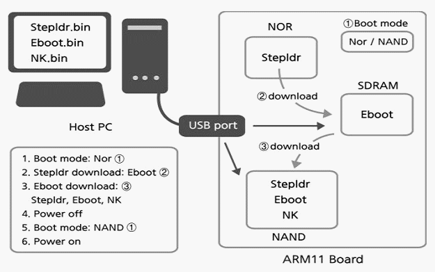 Eboot은 많은 일들을 하는데, 가장 많이 사용되는 용도는 stepldr.bin, eboot.bin, nk.bin을 플래시 메모리에 퓨징(Fusing)을 할 수 있도록 해 준답니다. Linux에서 사용하는 u-boot이랑 거의 비슷한 역할을 한다고 보시면 됩니다.