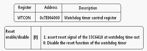 다음으로는 Watchdog timer를 disable 한답니다. Watchdog timer control register라고 불리는 WTCON 레지스터이며, [0]bit의 값이 0이라면 Disable the reset function of the watchdog timer의미를 가진답니다. 그래서 [0] bit값을 0으로 설정하면 된답니다.