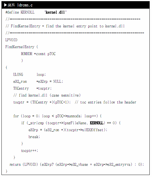FindKernelEntry 함수에서는 Kernel.dll 찾은 다음 Kernel.dll의 시작 함수로 점프 한답니다. (C:\WINCE600\PRIVATE\WINCEOS\COREOS\NK\ldr\ldrcmn.c)