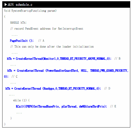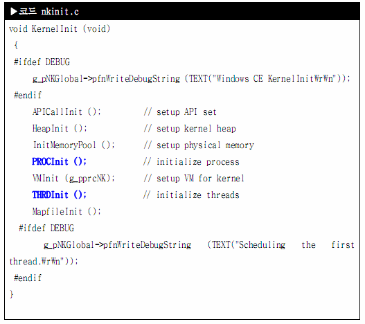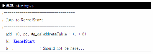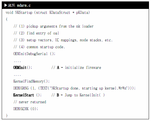 부트로더 이후 커널로 진입을 하면 NK.EXE 프로세스가 실행 되는데, 가장 먼저 실행되는 소스 코드는 startup.s랍니다. 여기에는 개발 보드 설정관련 및 KernelStart 함수를 호출한답니다.