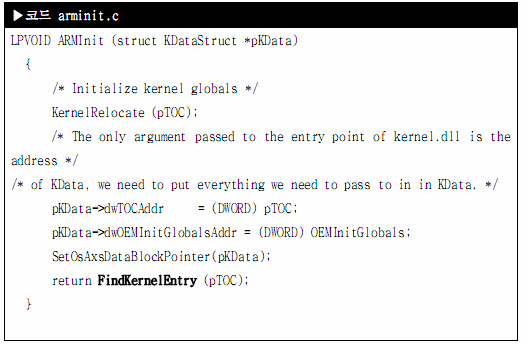 ARMInit 함수에서는 Kernel.dll 로딩해서 실행하기 위한 준비를 하게 되죠. (C:\WINCE600\PRIVATE\WINCEOS\COREOS\NK\LDR\ARM\arminit.c)
