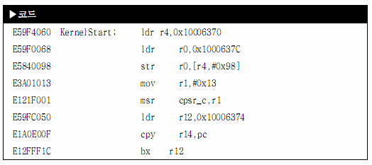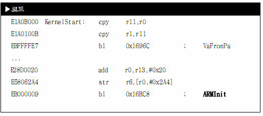 이제 KernelStart 함수로 가게 되는데, 이 쪽은 library로 되어 있어 소스를 볼 수가 없어요. 그래서 Disassembler code를 보시면 KernelStart 함수가 있고, 여기서는 다시 ARMInit 함수 호출을 하는 것을 볼 수가 있답니다.