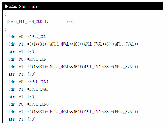 APLL은 ARM core를 동작시키기 위해서 설정하는 PLL이랍니다. MPLL은 AXI, AHB, and APB bus 동작을 위해서 사용된답니다. 그리고 EPLL은 일반적인 패리퍼럴을 동작하기 위한 클럭으로 사용되는데, 주로 UART, IIS, IIC 등 사용된답니다.