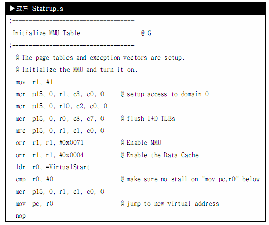다음으로 MMU 관련한 부분을 설정한답니다. 부트로더가 커널 바이너리를 SDRAM으로 복사될 때 그냥 복사하는 것보다 캐시를 사용해서 복사를 되면 1.5배 빠르게 때문에 캐시 사용을 위해서 MMU 관련 설정을 한답니다. 그래서 부트로더는 물리주소가 아닌 가상 주소에서 동작을 하게 되어 있답니다.