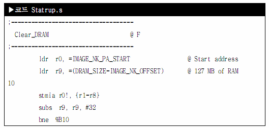 다음으로 SDRAM을 초기화 해 보죠. 부트로더가 커널 바이너리를 SDRAM으로 복사하기 위해서 SDRAM이 읽고/쓰기 상태가 되어야 하니 초기화를 해야 하죠.