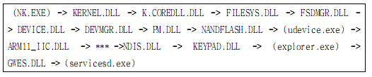 NK.EXE -> KERNEL.DLL -> K.COREDLL.DLL -> FILESYS.DLL -> FSDMGR.DLL -> DEVICE.DLL -> DEVMGR.DLL -> NDIS -> GWES.DLL