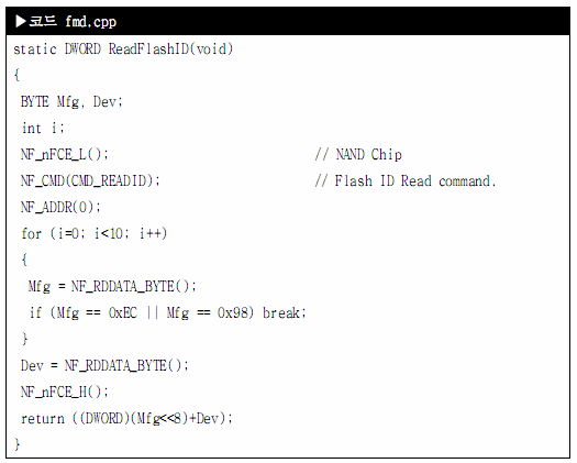 제일 먼저 CPU가 현재 개발 보드에 어떤 낸드가 있는지 확인하는 과정을 'NAND ID' 체크라고 하고, 'NAND ID' 정상적인 값이 나온다면 하드웨어적으로 CPU와 낸드 플래사 사이의 인터페이스 및 낸드 컨트롤러 설정하는 소스에는 문제가 없다는 뜻이랍니다. 'NAND ID' 값은 개발 보드에 붙여 있는 낸드 플래시 이름을 보고, 해당 이름을 인터넷으로 검색해서 데이타 시트를 찾아보면 알 수가 있답니다. 검색어를 Device code 라고 하시면 ID값이 나온답니다.