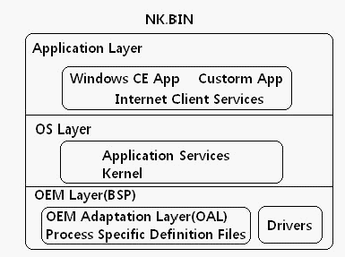 커널이 포함되어 있는 NK.BIN에는 OEM Layer인 BSP 관련된 것과 OS의 핵심인 커널, 디바이스 드라이버, 어플리케이션 서비스, 응용 프로그램 등 다양한 컴포넌트들이 있답니다.