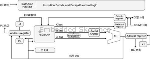가장 기본이 되는 3단계가 있고, 조금 더 세부적으로 나눈다면 5단계, 8단계, 13단계가 있답니다. 3단계만 있으면 되지 않을까 하는 생각도 하시겠지만 조금 더 빠른 처리속도를 내기 위해서는 변화가 필요하답니다. 그래서 ARM7은 3단계, ARM9은 5단계, ARM11은 8단계, CortexA8는 13단계랍니다. 파이프 라인의 구조는 ARM core 내부를 들여다 보면 알 수 있는데, 아래의 그림은 ARM9 core랍니다.