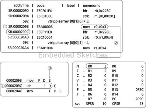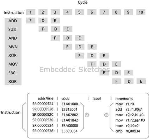 Stall 발생하지 않고 동작을 하는 것을 알 수가 있지요. 파이프 라인 공부하시는 분들이 하드웨어 디버거를 이용해서 파이프 라인을 분석하실 때 많이 헷갈린다고 이야기를 하시는데, 왜 그럴까요? 한 번 살펴볼까요?하드웨어 디버거를 이용하여 0x209C ① 주소에서 Breakpoint 걸고 나서 Core를 Running하면 0x209C에 멈추게 된답니다. 멈추게 됐을 때 0x209C는 Fetch/Decode/Execute 중 어느 단계에 해당 될까요? 우선 현재 PC의 이전 주소인 0x2098 주소를 보죠. 0x2098 ② 주소에 MOV 명령어가 있고, 이 명령어는 R0 레지스터에 0x3 넣는 것인데, 현재 레지스터 값을 보니 이미 0x3이라는 값이 들어가 있군요. 어라? 이건 무슨 시츄에이션...그렇다면 분명 0x2098은 Execute 단계라는 결론과 함께 0x209C 는 Decode ③ 단계라는 이야기가 되는 군요. 맞나요? 정말요? Really? 아닙니다요. PC는 항상 Fetch를 가르쳐야 되는 거잖아요. 그럼 왜 틀렸는지 설명 드리죠.하드웨어 디버거는 여러 종류의 디버거가 있는데, 임베디드 시스템에서 가장 많이 사용하는 하드웨어 디버거가 바로 JTAG 기반을 둔 툴이랍니다. 이 툴들은 Real-time성이 깨진다는 특징을 가지고 있답니다. 무슨 말인고 하니, JTAG 기반의 툴들을 이용했을 때 실제 파이프 라인을 고려해서 디버깅 해 주는 것이 아니라 파이프 라인을 무시하고 디버깅을 해 준답니다. 결론은, 이론적으로는 0x209C가 Decode가 되어야 하지만 하드웨어 디버거를 사용한다면 파이프 라인이 무시되고 Fetch-Decode-Execute가 한꺼번에 실행 된답니다. 0x209C 주소에 멈추어 있을 때 0x2098 주소에 있는 코드는 Execute가 끝난 상태이고, 0x209C는 다시 Fetch-Decode-Execute 단계를 한꺼번에 실행할 준비를 하고 있는 상태랍니다.