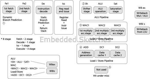멈추고 난 후 하드웨어 디버거에서 Step 같은 명령을 내리면 0x209C 주소의 명령어가 실행 준비를 하는데, 이때 Fetch-Decode-Execute 단계를 한꺼번에 처리하면서 ARM core가 동작된답니다.그런데, 파이프 라인을 정확히 지켜 주는 때가 있답니다. 바로 변수에 Write breakpoint를 설정한 경우랍니다. 이 부분은 "508 하드웨어 디버거와 Breakpoint" 에서 자세히 다루어 보도록 할게요. ARM11 Core이제부터 파이프 라인은 아주 복잡해 진답니다.파이프 라인은 Fetch stage 2단, Decode Stage, Issue Stage, Execute Stage 4단으로 총 8단계로 구성되어 있답니다.