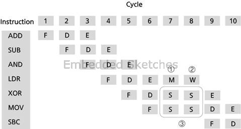 ARM7 같은 경우에는 메모리에서 데이타를 읽는 Memory stage①와 레지스터에 쓰기를 하는 Write stage②가 추가가 된답니다. 하지만 ARM7에는 3단계 밖에 없기 때문에 이러한 단계에서는 모두 Stall ③ 된답니다.