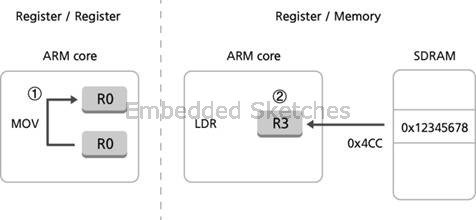 ARM 명령어 중에 LDR 명령어가 사용이 된다면 파이프 라인 동작단계는 조금 달라진답니다. LDR 명령어는 메모리에 접근하는 명령어랍니다. ARM core는 레지스터/레지스터 명령어와 레지스터/메모리 명령어로 크게 두 가지 명령어군으로 구성되어 있답니다.레지스터/레지스터 명령어레지스터/메모리 명령어명령어 mov r1,r0 add r2,r1,#0x1 sub r0,r1,#0x1 ... ldr r3,0x4CC str r3,0x4CC ....비고mov 명령어가 실행될 때는 단지 R1, R0 레지스터만 있으면 된답니다. add 명령어가 실행될 때는 단지 R2, R1만 레지스터만 있으면 된답니다.ldr 명령어가 실행될 때는 R3 레지스터와 0x4CC인 메모리의 주소가 필요 합니다.레지스터와 레지스터 명령어①는 ARM Core내에서 동작하기 때문에 실행속도가 매우 빠른 반면에 레지스터와 메모리②간의 명령어는 외부 버스를 통해 접근하기 때문에 상대적으로 속도가 느리고, 더불어 파이프 라인 단계도 추가가 된답니다.