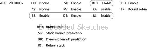 Dynamic branch prediction는 과거 기록을 사용해서 똑 같은 분기가 이전에 있었는지 없었는지, 실행되는 횟수가 많을지, 실행되지 않는 횟수가 많을지를 조사한답니다. 이것은 BTAC(Branch Target Address Cache)에 의해 이루어진답니다. Branch명령의 주소는 BTAC의 entry정보와 맞을 경우 이곳에서 명령어를 fetch한답니다. Co-processor의 CR(Control Register) 레지스터 Z[11]bit을 조절하면 Program Flow Prediction을 Enable/Disable을 설정할 수가 있답니다. 만약 Z bit가 enable이 됐다면, 다시 ACR(Auxiliary Control Register) 레지스터에 의해 static branch prediction, dynamic branch prediction, return stack, Branch folding 설정할 수가 있답니다. 소스 코드를 보면 다음과 같아요.먼저 Program flow prediction enabled 해 주셔야 합니다. ▶코드 mmu.s MRC p15,0,r0,c1,c0,0 ; Read Control Register configuration data ORR r0, r0, #0x800 ; 1 = Program flow prediction enabled MCR p15,0,r0,c1,c0,0 ; Write Control Register configuration data 하드웨어 디버거로 Co-processor 레지스터를 확인해 보죠.