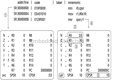 PSR에 해당되는 CPSR, SPSR 레지스터 같은 경우는 반드시 ARM 명령문만 가능하고, 명령어는 MRS, MSR 있답니다. CPSR에 있는 control bit들을 제어 해 보도록 하죠. ARM core는 디폴트 모드가 SVC이고, 인터럽트는 모두 Disable되어 있답니다. 그래서 CPSR은 0xD3①으로 되어 있죠. 0x30000000 주소의 mrs 명령어가 실행되는 CPSR에 있는 값을 읽어서 R0 레지스터②에 저장을 한답니다. 그리고 개발자가 바꾸고 싶은 cpsr 값③을 지정하고, msr 명령어가 실행④되면 CPSR은 0x10이라는 값⑤을 가지게 되며 USR 모드로 바뀌게 되는 거랍니다. 이 명령어는 주로 모드 전환이 필요할 때 많이 쓰이는 명령어랍니다.