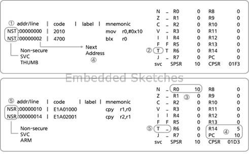 하드웨어 디버거를 통해 ARM1176JZF-S 프로세서에서 동작을 시켜 보도록 해 보죠. 0x00000000 주소에 mov 명령어가 있으면, 현재 Thumb ①명령어 상태이고 T bit가 "1"로 ② 된 상황이랍니다. 0x0 주소의 Mov 명령어가 실행되면 R0에는 0x10이라는 값이③ 들어가고, bx r0를 실행하면 r0의 주소④로 점프를 하는 것과 동시에 0x10이라는 값에서 제일 마지막 bit가 홀수이냐 짝수이냐에 따라 ARM/THUMB 명령어 상태로 바뀌게 된답니다. 0x10을 binary형태로 표현을 하면 "0001 0000" 이며, 마지막 비트가 "0" 이므로 ARM 명령어 ⑤상태로 바뀌게 되죠.