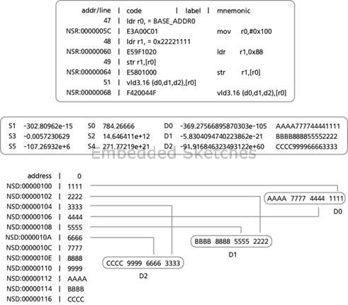 이 프로그램은 0x100~114까지 0x11112222~0xBBBBCCCC 데이타가 들어가고, NEON 레지스터 D0~D2까지 로딩을 한답니다.