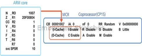 ARM core에 레지스터가 있듯이 코프로세서에도 레지스터가 있는데, 각 레지스터 역할을 살펴보면 다음과 같아요. 특히 C15:1 같은 경우는 MMU나 Cache 을 Enable/Disable하는 역할을 하죠.