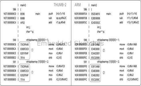 하드웨어 디버거로 직접 명령어를 확인 해 보도록 하죠. THUMB-2로 컴파일을 했을 때 ARM 명령어와 THUMB 명령어①가 섞여 있는 것을 알 수가 있지요. 반면 -marm 옵션으로 컴파일을 하면 ARM명령어②만 만들어 진답니다.