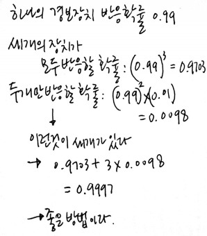 핵연료봉의 핵누출이 있었는지를 확인할 수 있는 경보기를 설치하려고 한다. 경보기의 신뢰도는 99%이며, 신뢰도를 더 좋게 하기 위하여 경보기를 3개 설치하려고 한다. 이때 어떤 Policy로 경보기를 울리게 하면 신뢰도가 향상될까? 그리고, 그때의 신뢰도는 얼마가 될까?