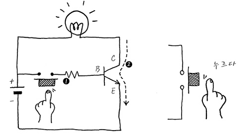 그럼, 그 Switch를 세게 누른다는 건 무엇이냐 하면, B와 E사이에 전압을 얼마나 세게 주느냐의 문제라고한다면, 바로 그것이 Transistor의 Technology입니다. TR은 평소에는 전류가 흐르지 못하다가 화살표 방향으로 전압을 넣어주어, 전압의 양을 얼마나 넣어줄꺼냐에 따라 C와 E사이의 전류량을 결정할 수 있습니다. 가장 중요한 한가지는 B에 넣어주는 전압(전류)량의 미묘한 변화에도 저항값이 휙휙많이 바뀐다는 것입니다. 결국 EC간의 전류 값도 휙휙 변하겠지요.