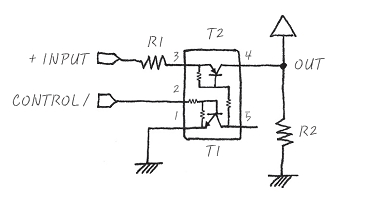 이 회로는 npn형 T1, pnp형 T2 트랜지스터가 맞물려 있으며, input으로는 +INPUT, CONTROL/가 있고, Output이 오른쪽 상단에 OUT port로 나와 있습니다. 이 회로는 어떻게 동작하는 것일까, 일단 이 회로는 DC회로이며, CONTROL/에 의해서 control된다고 보면 됩니다. 이 회로는 R1과 +INPUT신호를 이용한 Pull up입니다. 일단 CONTROL/가 high일 때는 T1이 ON되며, 이때 그렇게 되면 +INPUT은 3번 port와 5번 port를 따라 전압을 소진하게 되면서 동시에 T2가 ON 되지요. 5번 port는 T1이 ON이 됨에 의하여 1번 port의 GND에 연결되니까 그렇습니다. 그러므로 OUT으로 연결되는 T2가 ON 되었으니까 OUT에 INPUT가 거의 다 걸리게 되는거죠. 그러면 이번엔 반대 case인 CONTROL/의 신호가 low인 경우에는 어떻게 되는가 하면, CONTROL이 Low가 되면서 T1이 off가 되고요, T2는 덩달아서 off가 되지요. 결국, +INPUT신호는 오갈 곳 없어 지는 거고 OUT에는 아무 것도 걸리지 않는 거지요. 결국 CONTROL/신호가 LOW일 때 OUTPUT에 아무것도 걸리지 않고, CONTROL/ 신호가 High일 때는 +INPUT신호가 OUT으로 나가게 되는 회로가 됩니다