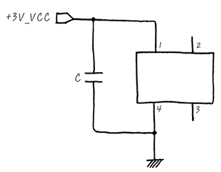 가장 간단하게, Chip에 3V DC전원을 인가 하기 위한 회로 입니다. 여기에서 C의 용법은? AC인 고주파만 통과시키고요, 3V 전원이 인가 될 때, AC성분을 GND로 흘려 Chip에 들어가는 것을 차단하기 위한 Capacitor입니다. 여기에서 AC는 전원 Noise따위 이죠. 또는 전원이 켜질 때 Transition으로 생기는 Noise따위를 제거 하기 위한 것입니다. Ripple제거라고도 하는데,이런 작은양의 DC의 흔들림 (AC성분)을 Ripple이라고도 부릅니다. 앞서 살펴본 Low Pass Filter와 같구요, 이런 경우 C만 보이지만, +3V_VCC를 거꾸로 따라가 보면,