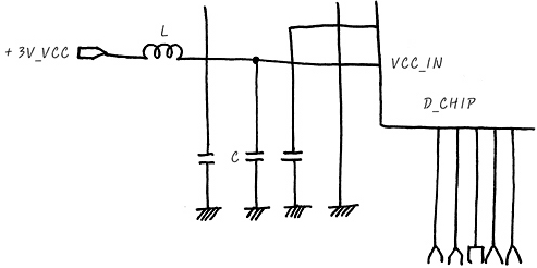 이 회로에서 +3V_VCC가 전원이며, 이 전원이 D_CHIP의 VCC_IN에 drive되어D_CHIP이 동작하도록 하는 것 입니다. 이 회로중 L과 C는 어떻게 사용되느냐 하면, L은 AC에게는 큰 저항, DC에게는 저항 없음이고요, C는 AC에게는 저항 없음이고, DC에게는 큰 저항입니다. 이런 거라면 +3V_VCC의 DC성분을 안정적으로 VCC_IN에 안정적으로공급하기 위한 것입니다. 당연히 Ripple 제거죠.