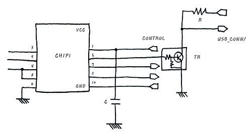 이 회로는 chip1에 CONTROL신호를 넣으면 USB_CONN/를 구동하는 회로입니다.