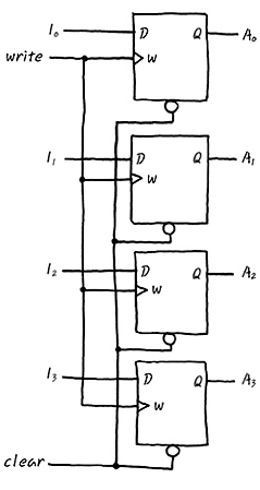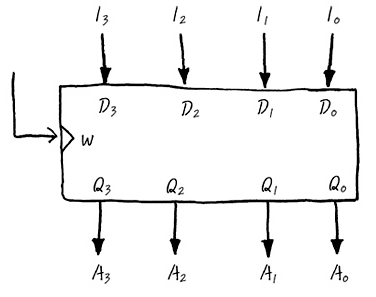 이런 1bit Latch를 엮어 n-bit Latch (n bit Register)를 만들기도 하는데, 그런건 아래 그림과 같이 여러개의 1bit Latch를 엮어서 만들어 냅니다. I0, I1, I2, I3는 모두 Input Data이며, A0, A1, A2, A3는 Output Data이며, Write 신호가 Edge일경우에만 Input Data로 Output들이Update되며 그 내용을 유지하고 있습니다.