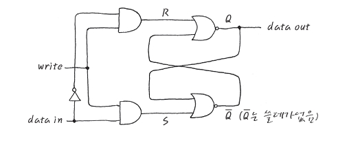어쨌거나,가장 간단한 형태의 Flip Flop이라는 것은 실은 NOR gate 두개의 output을 서로의 input으로 다시 feed back 하는 형태로 생겼습니다. R-S (Reset Set) F/F라고 부르기도 합니다. 잘 보시면, Data In은 data input이고, write는 Write Enable이라고 해서 Write TRUE가 되어야 Data In을 위쪽 AND gate나 아래쪽 AND gate로 넣을 수가 있습니다.